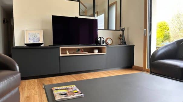 L’équipe des Cuisines J. Kergourlay a créé un meuble télé pour un salon à Concarneau.…