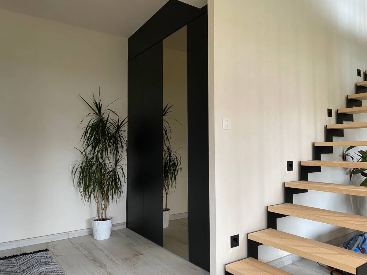 Face à la porte d’entrée, nous avons imaginé un placard élégant et pratique, réalisé en coloris noir mat. Doté de quatre portes battantes, ce meuble intègre des solutions astucieuses pour répondre aux besoins du quotidien. L’une des portes inclut un miroir couleur bronze, offrant une touche d’élégance tout en étant fonctionnel pour les derniers ajustements avant de sortir. Ce meuble cache une penderie spacieuse et des étagères, permettant de ranger manteaux, chaussures et accessoires, loin des regards. La partie supérieure, montée jusqu’au plafond, dissimule habilement une poutre existante, tout en maximisant le volume de rangement.